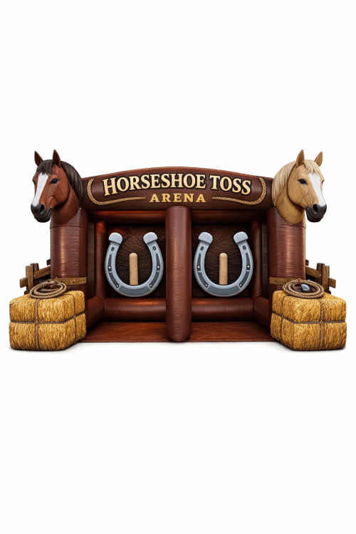 Step right up to the Western Horse Shoe Toss — a western-themed inflatable game that turns any party into a fun, family-friendly competition. Two players can stand side-by-side inside the cushioned arena and take turns tossing rings toward oversized horseshoe targets, with hay bale accents and horse head décor adding rustic charm. Safe, easy to use, and visually eye-catching, it’s perfect for backyard parties, school events, fairs, or corporate family days where guests of all ages can test their aim and enjoy a little friendly rivalry.
